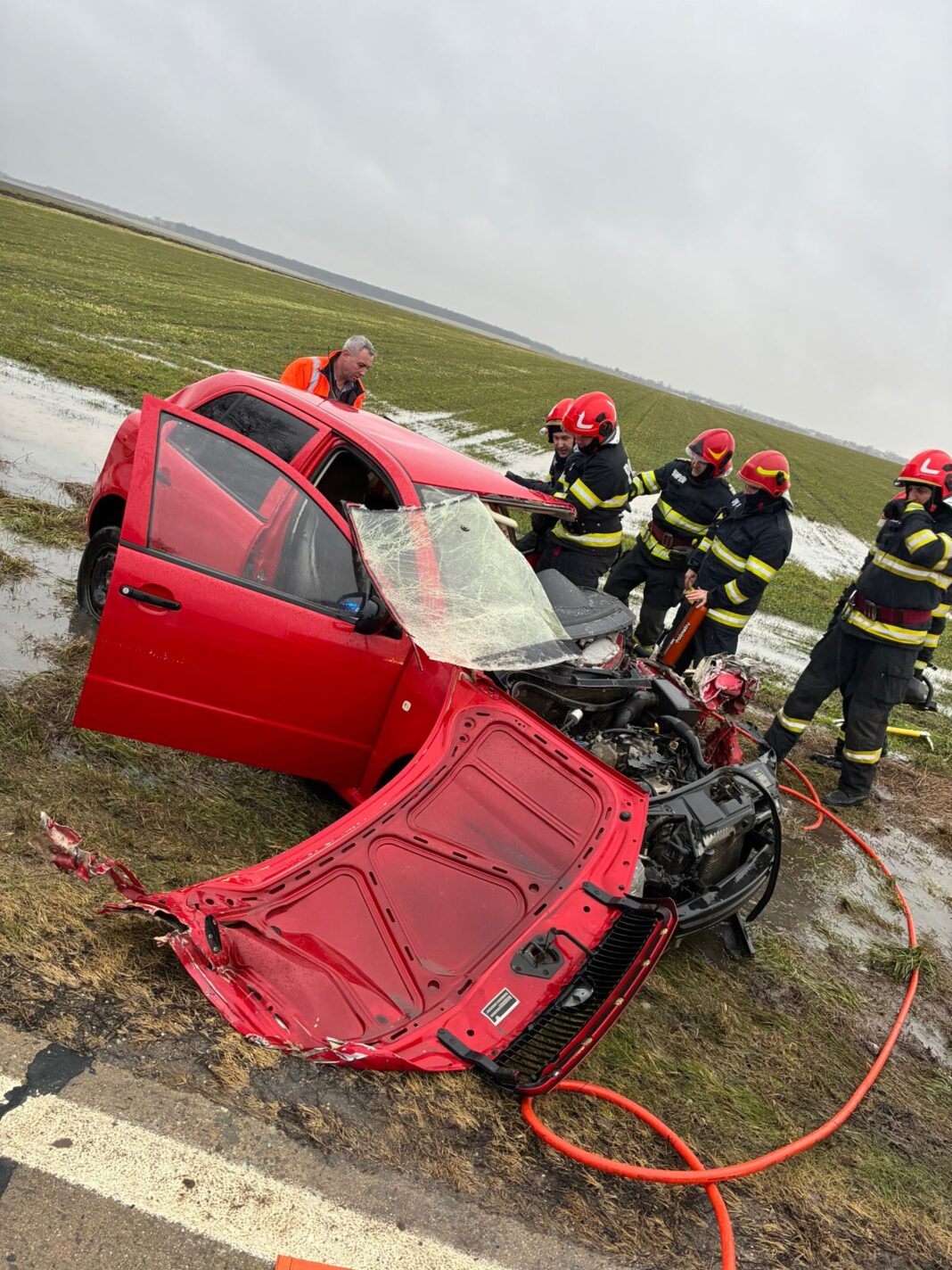 Salvatorii depun eforturi disperate pentru a readuce la viață victima rămasă blocată între fiarele contorsionate ale mașinii.