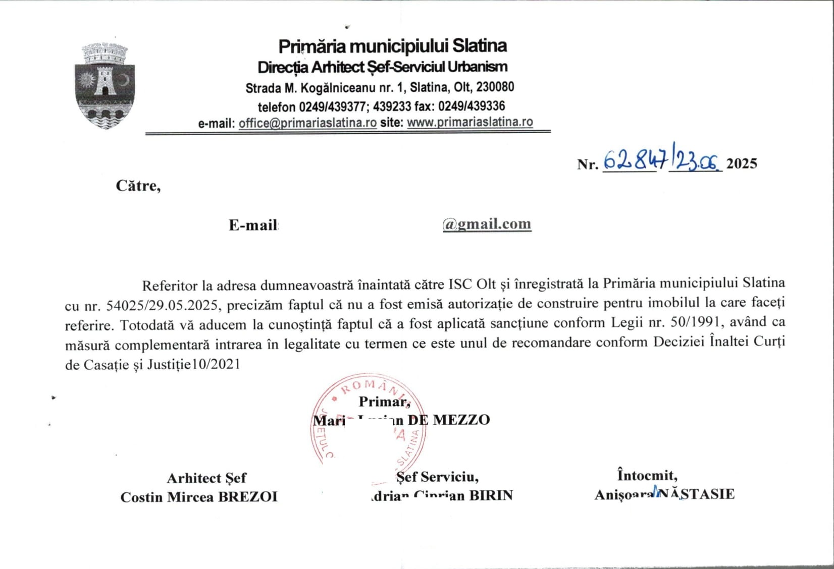„Referitor la adresa dumneavoastră înaintată către ISC Olt şi înregistrată la Primăria municipiului Slatina cu nr. 54025/29.05.2025, precizăm faptul că nu a fost emisă autorizație de construire pentru imobilul la care faceți referire. Totodată vă aducem la cunoştinţă faptul că a fost aplicată sancțiune conform Legii nr. 50/1991, având ca măsură complementară intrarea în legalitate cu termen ce este unul de recomandare conform Deciziei Înaltei Curți de Casaţie şi Justiţie 10/2021”, se arată în răspunsul Primăriei Slatina.