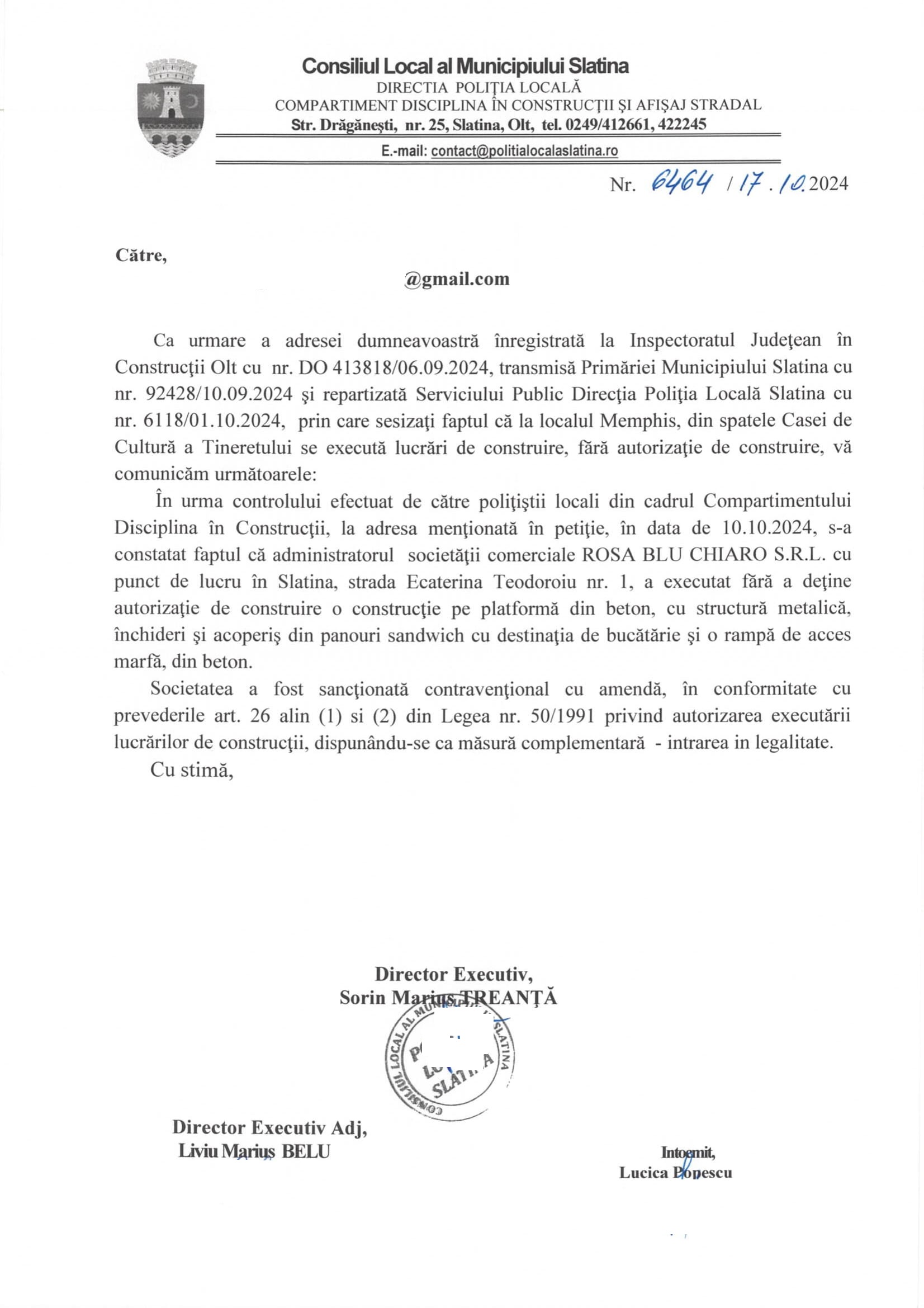 „În urma controlului efectuat de către poliţiştii locali din cadrul Compartimentului Disciplina în Construcţii, la adresa menționată în petiție, în data de 10.10.2024, s-a constatat faptul că administratorul societății comerciale ROSA BLU CHIARO S.R.L. cu punct de lucru în Slatina, strada Ecaterina Teodoroiu nr. 1, a executat fără a deține autorizație de construire o construcţie pe platformă din beton, cu structură metalică, închideri şi acoperiş din panouri sandwich cu destinația de bucătărie și o rampă de acces marfă, din beton.