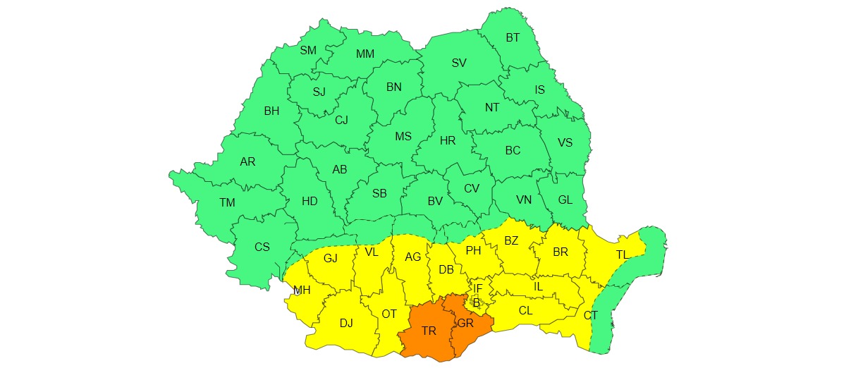 Codul Galben este valabil şi sâmbătă, 24 august, pentru Crișana, sud-vestul Transilvaniei, vestul și nordul Olteniei, cea mai mare parte a Munteniei şi Dobrogea continentală.
