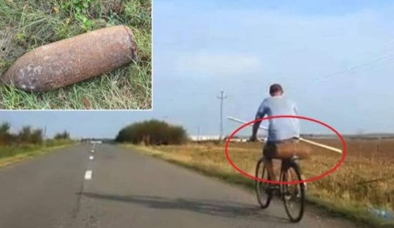 Un bărbat a fost filmat în timp ce transporta cu bicicleta, pe un drum din Arad, o bombă de aviaţie care cântărea 50 de kilograme. Ulterior, el a abandonat bomba pe marginea drumului, iar o echipă pirotehnică a recuperat-o şi a distrus-o.