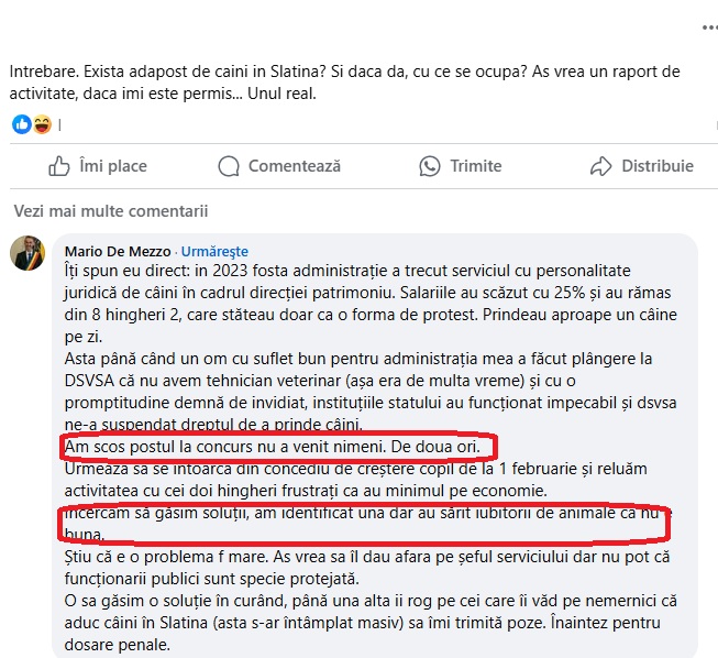 „Îți spun eu direct: in 2023 fosta administrație a trecut serviciul cu personalitate juridică de câini în cadrul direcţiei patrimoniu. Salariile au scăzut cu 25% și au rămas din 8 hingheri 2, care stăteau doar ca o forma de protest. Prindeau aproape un câine pe zi. Asta până când un om cu suflet bun pentru administraţia mea a făcut plângere la DSVSA că nu avem tehnician veterinar (aşa era de multa vreme) și cu o promptitudine demnă de invidiat, instituţiile statului au funcţionat impecabil şi dsvsa ne-a suspendat dreptul de a prinde câini. Am scos postul la concurs nu a venit nimeni. De doua ori. Urmeaza sa se intoarca din concediu de creştere copil de la 1 februarie şi reluăm activitatea cu cei doi hingheri frustrați ca au minimul pe economie. incercam să găsim soluții, am identificat una dar au sărit iubitorii de animale ca nu huna. Știu că e o problema f mare. As vrea sa îl dau afara pe șeful serviciului dar nu pot că funcţionarii publici sunt specie protejată. O sa găsim o soluție în curând, până una alta ii rog pe cei care îi văd pe nemernici că aduc câini în Slatina (asta s-ar întâmplat masiv) sa îmi trimită poze. Înaintez pentru dosare penale”, a comentat primarul Slatinei.
