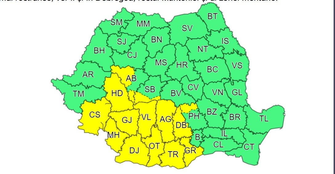 Meteorologii transmit că în Oltenia, vestul Munteniei, sudul Banatului și sud-vestul Transilvaniei vor fi perioade cu instabilitate atmosferică. Aceasta se va manifesta prin averse și cu caracter torențial, descărcări electrice, intensificări de scurtă durată ale vântului (cu