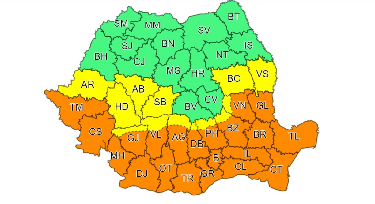 Un Cod Portocaliu ce vizeză un val de căldură persistent, caniculă și disconfort termic accentuat a fost emis de meteorologi pentru mai multe judeţe din ţară.