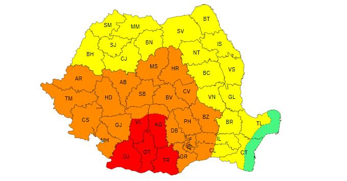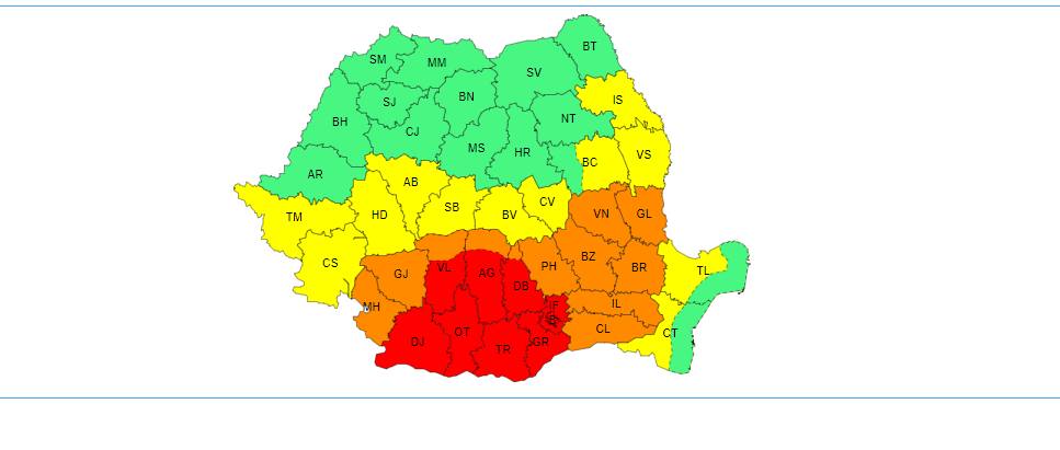 În județele Dolj, Olt, Teleorman, Giurgiu, Ilfov, în sudul județelor Vâlcea, Argeș, Dâmbovița, precum și în municipiul București, valul de căldură va fi intens și persistent, iar temperaturile vor fi deosebit de ridicate, pentru a cincea zi consecutiv. Temperaturile maxime vor fi de 38…39 de grade, iar cele minime, se vor situa în jurul a 20 de grade (nopți tropicale). Va fi caniculă și disconfort termic deosebit de accentuat, iar indicele temperatură-umezeală (ITU) va depăși pragul critic de 80 de unități.