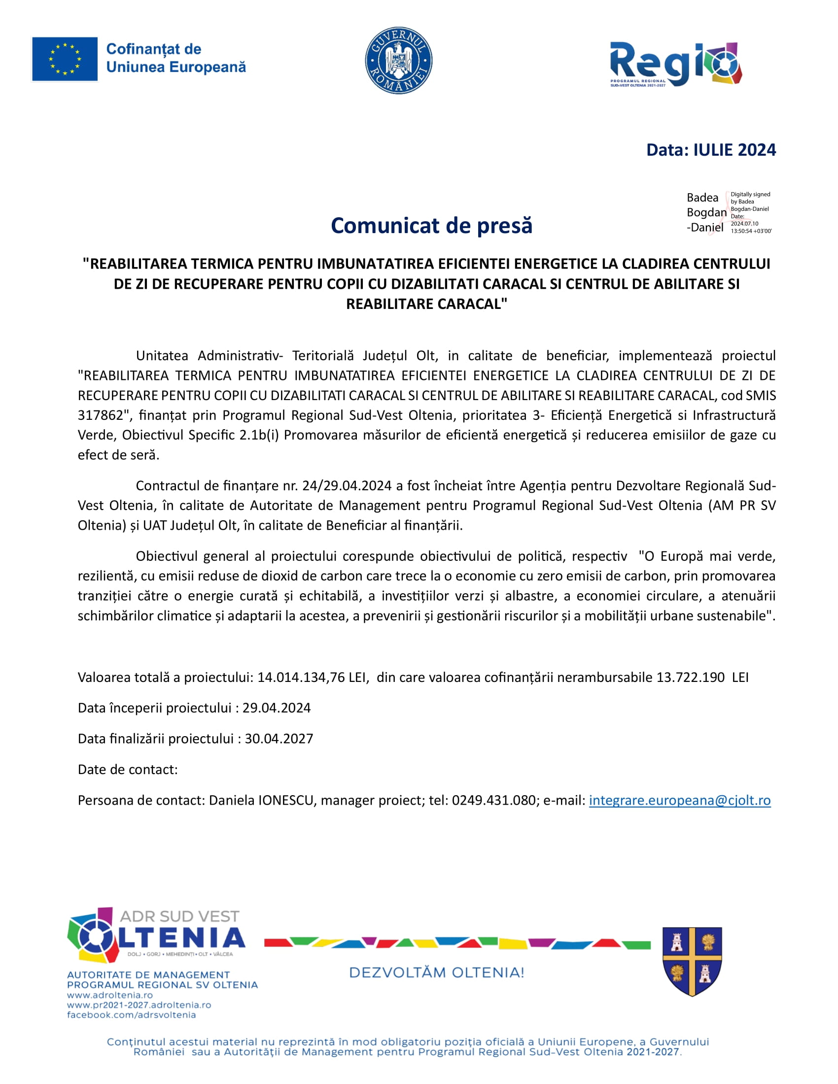 Comunicat de presă: Reabilitarea termică pentru îmbunătățirea eficienţei energetice la clădirea Centrului de zi de recuperare pentru copii cu dizabilităţi Caracal şi Centrul de abilitare şi reabilitare Caracal