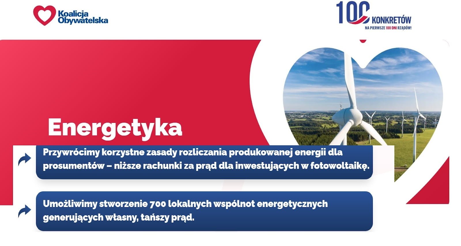1. „Permitem crearea a 700 de comunități locale de energie, care să genereze propria energie electrică mai ieftină”, a menționat Coaliția Civică (principalul partid de opoziție din Polonia), foarte specific, în cererile sale de campanie pentru primele 100 de zile.