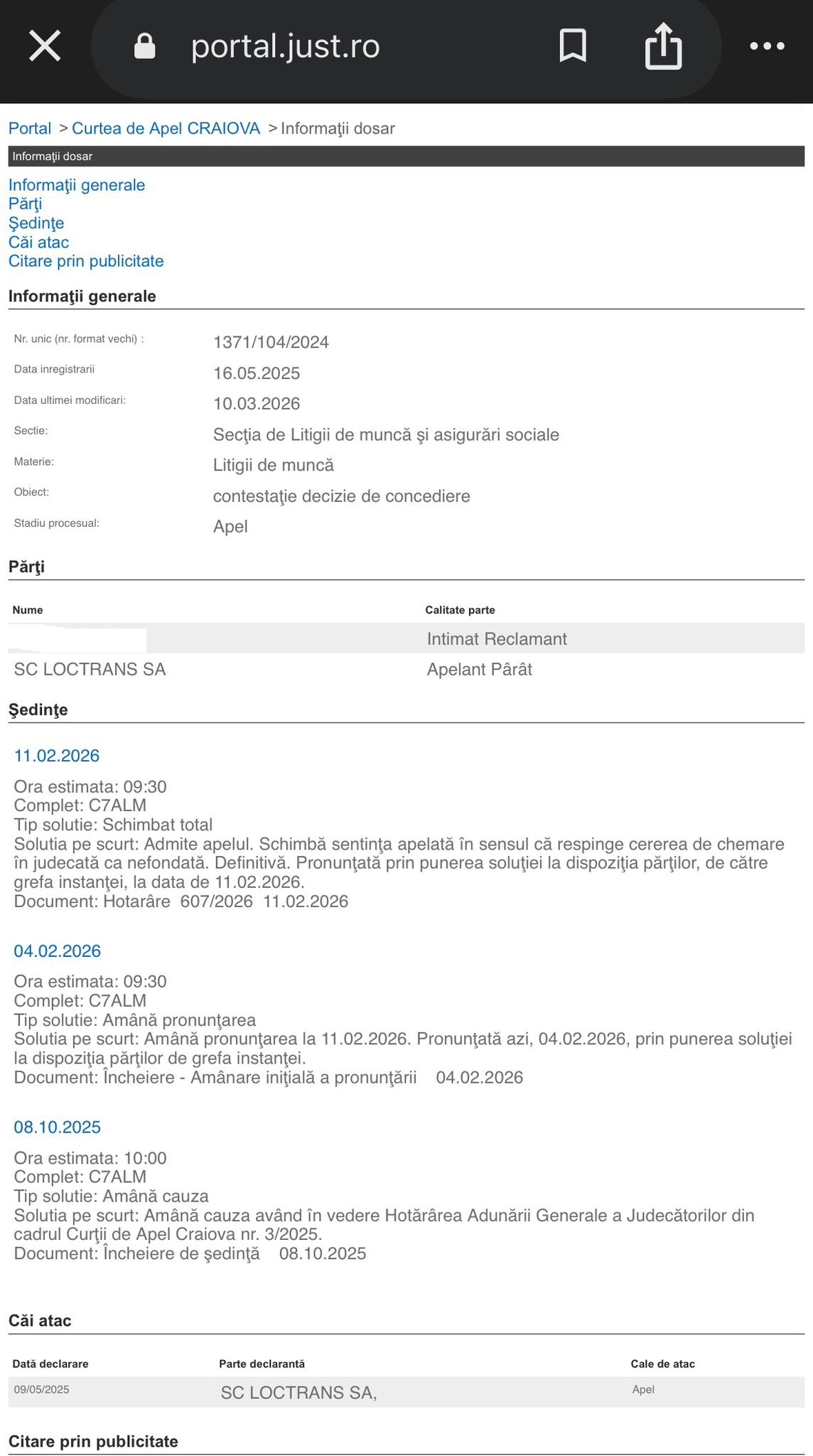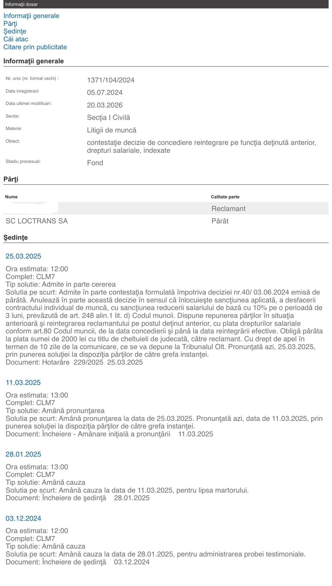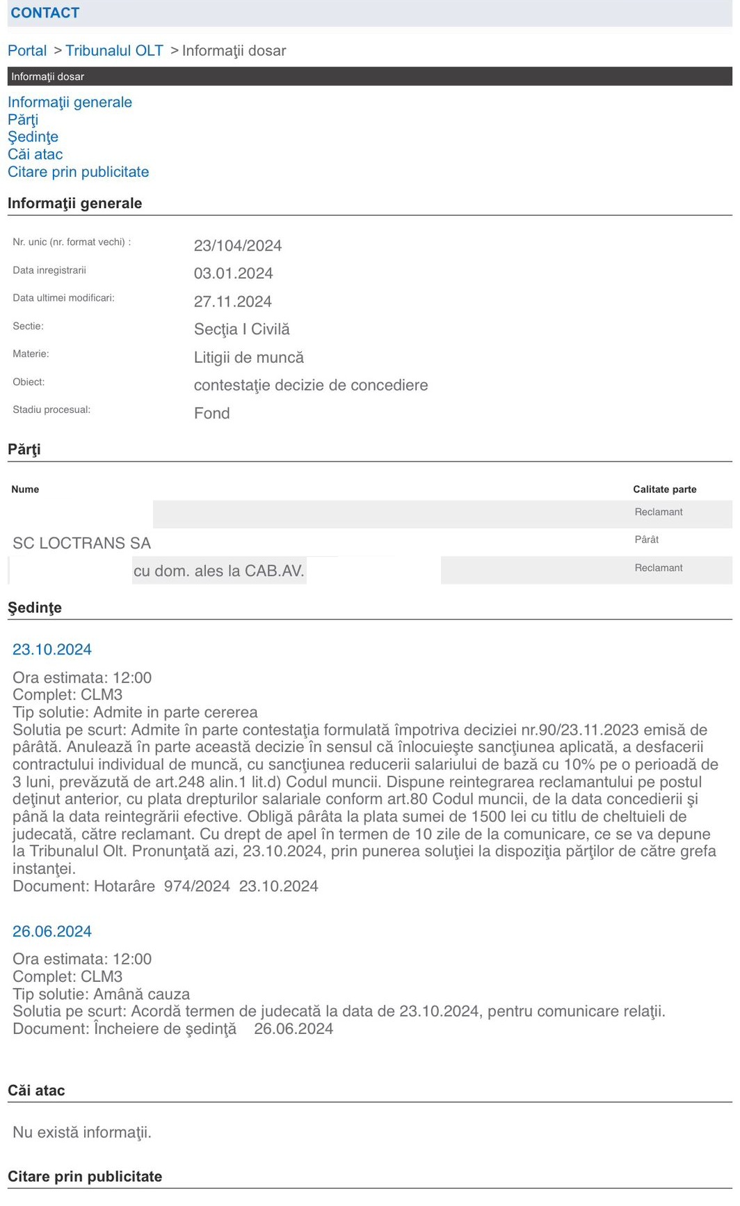 În cazul primului dintre ei, după ce a avut câştig de cauză la Tribunalul Olt, Loctrans nu a mai făcut contestaţie. Acesta a fost reîncadrat pe funcţi şi, în plus, a primit şi toate drepturile salariale din urmă.