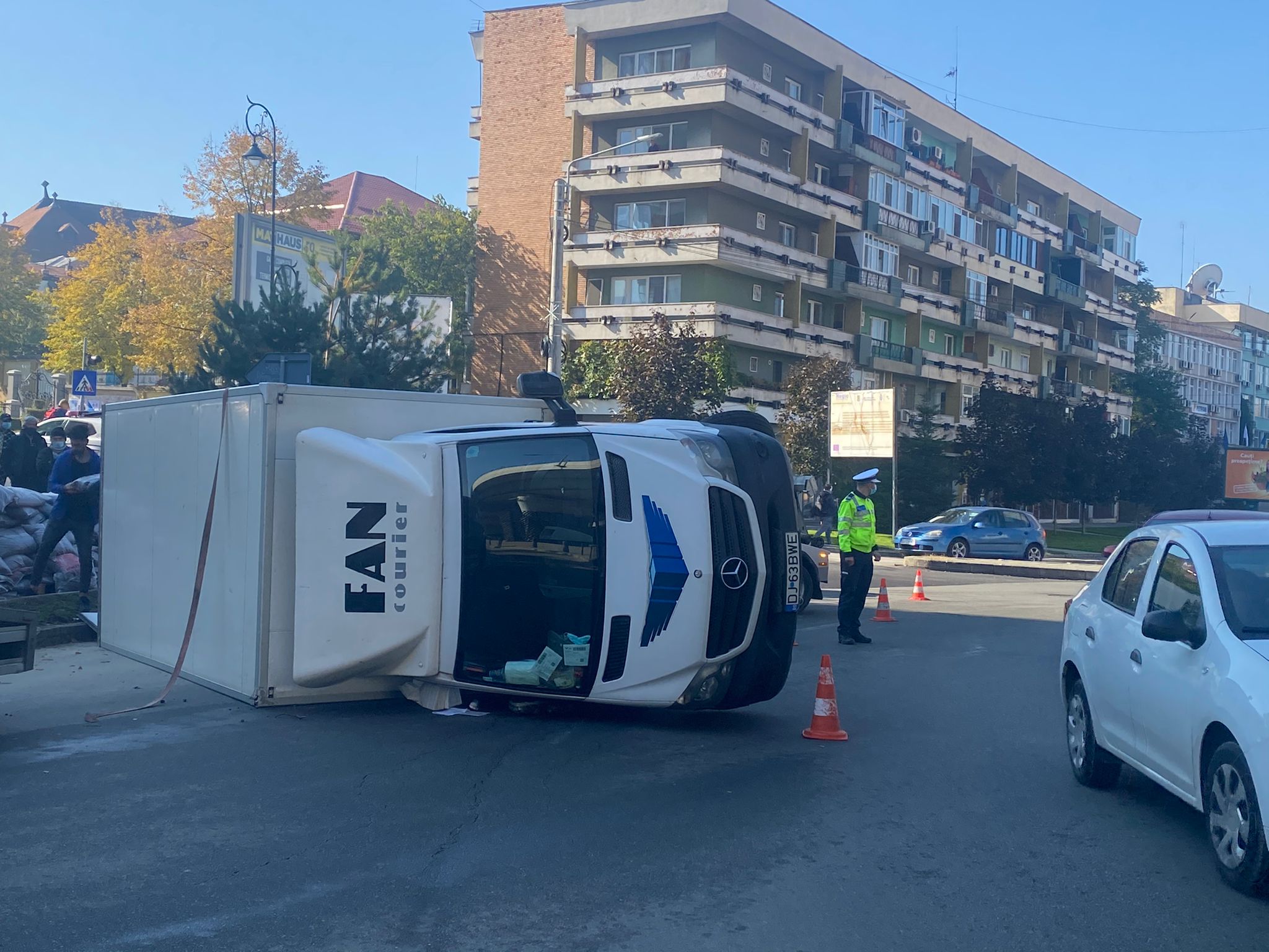 Dubă cu colete, răsturnată într-o intersecţie din Craiova