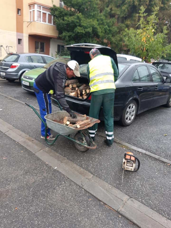 Lucrările respective au fost derulate în cartierul Craiovița Nouă. În imagini se observă cum angajații cu pricina duc lemnele, cu o roabă, în portbagajul unei mașini.