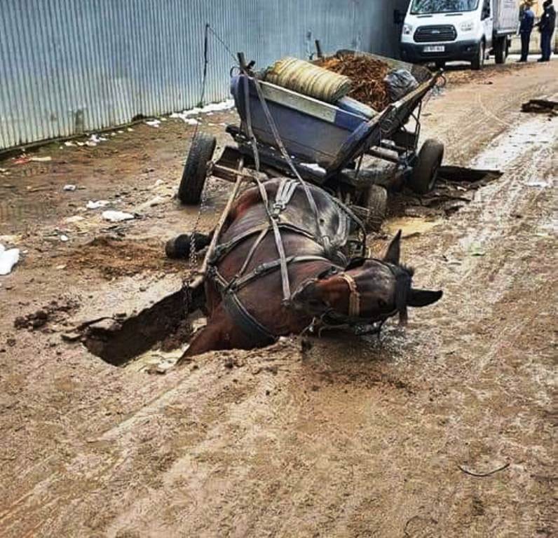 Imagini cu un cal ce trage o căruţă, căzut la propriu într-o groapă de pe o stradă din localitatea teleormăneană Bragadiru, au apărut pe Facebook.
