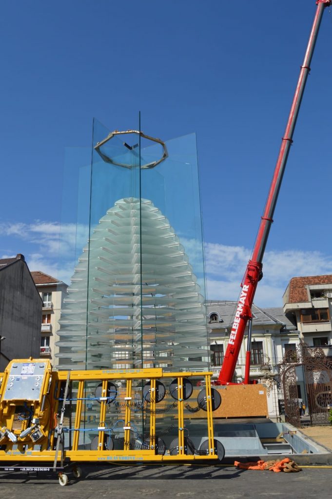 Panouri din sticlă de peste 2,5 tone și 12 metri lungime se montează, în aceste zile, pentru a completa forma perfectă a prismei de la Centrul Internațional „Constantin Brâncuși” construit în curtea Muzeului de Artă din Craiova.