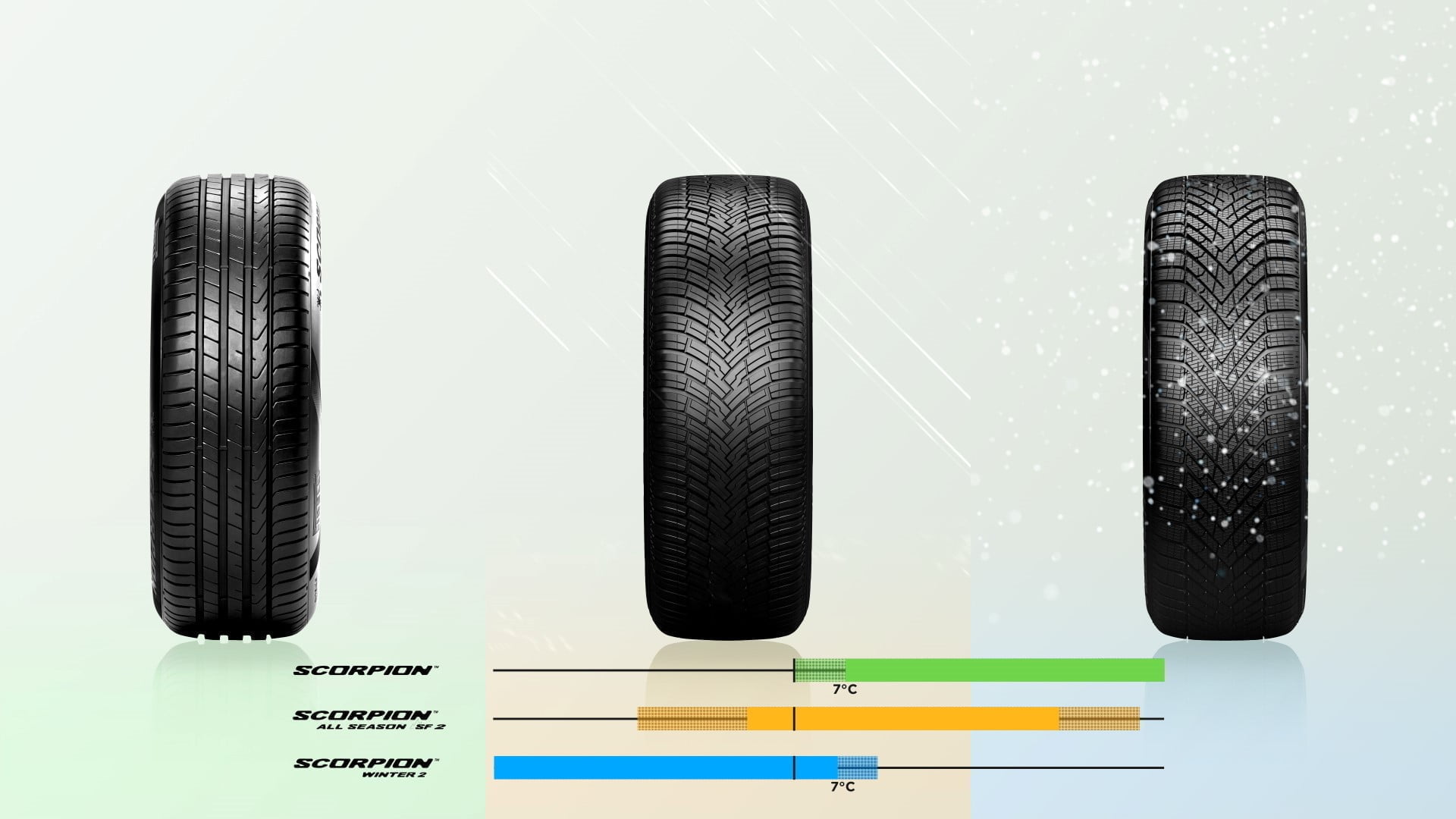 Noul Scorpion All Season SF2 se adresează persoanelor care doresc să respecte reglementările privind anvelopele de iarnă, dar nu doresc să aibă grija schimbării sezoniere a anvelopelor. Este disponibil în 33 de dimensiuni, între 17 și 21 de inch, în această fază de lansare. Simbolurile M+S însoțite de marcajul 3PMSF (Three Peak Mountain Snowflake) certifică performanțe excelente chiar și în condiții de iarnă. Anvelopele cu marcajul 3PMSF sunt aprobate de legislația europeană ca garanție a conformității cu reglementările de circulație a anvelopelor de iarnă.