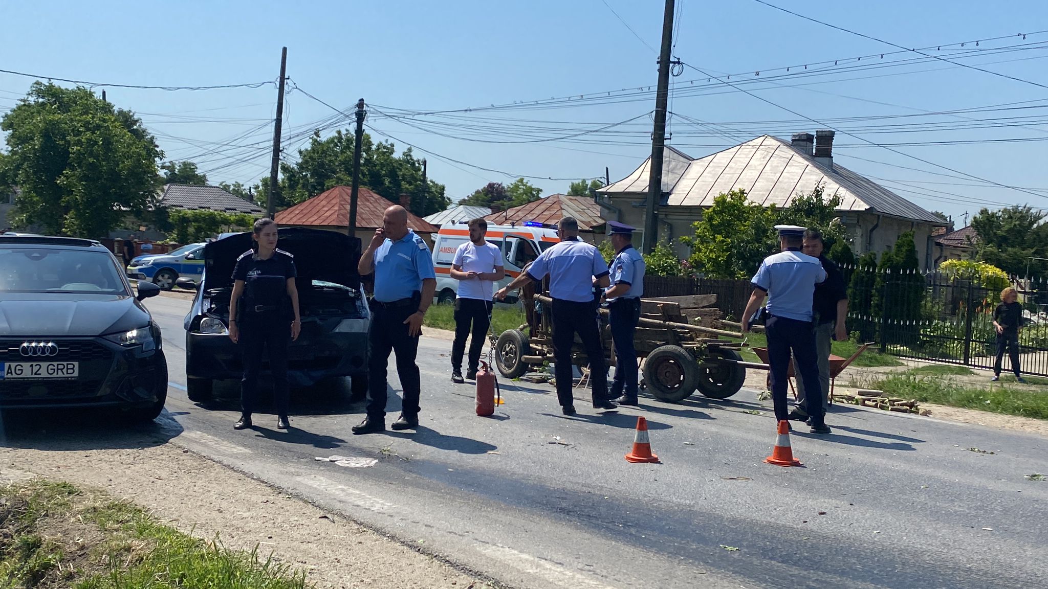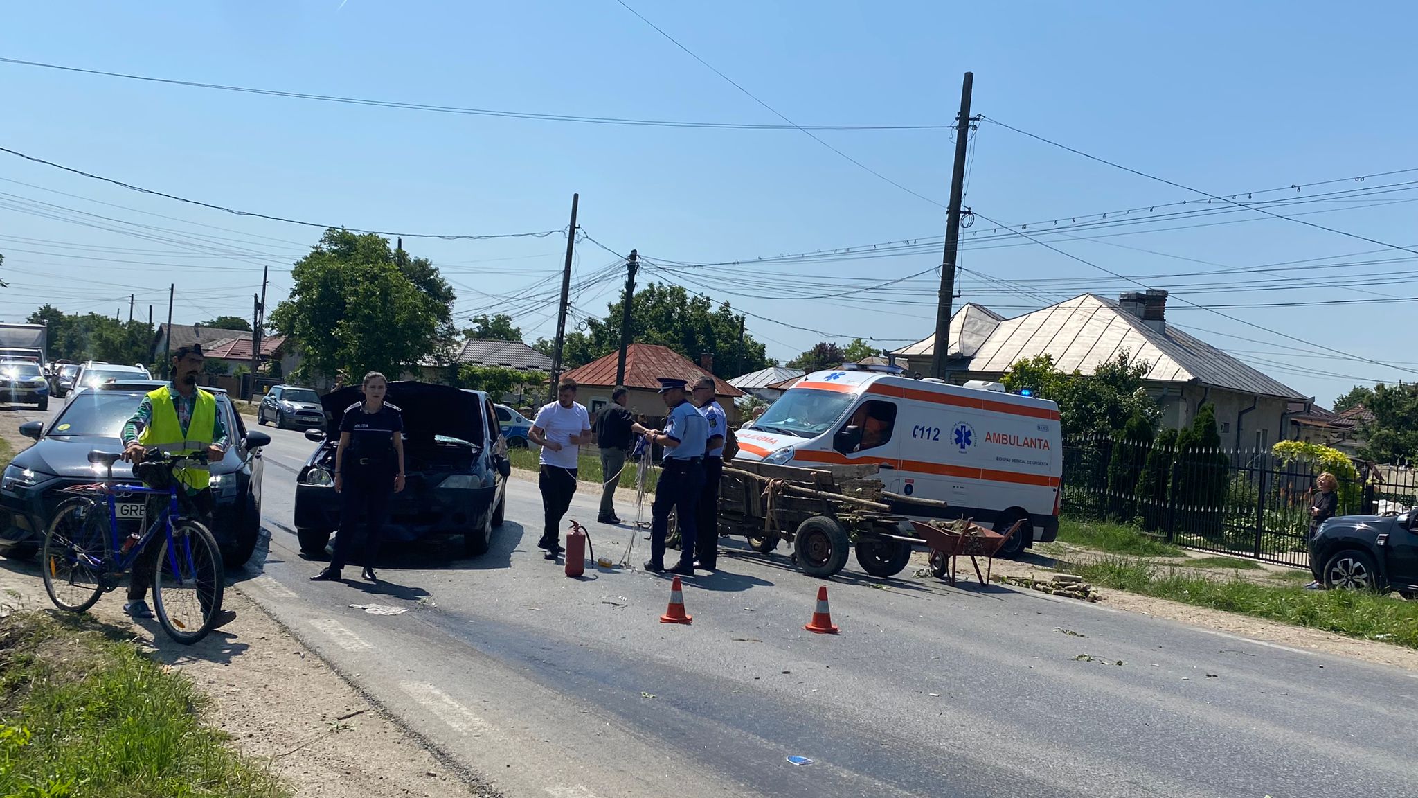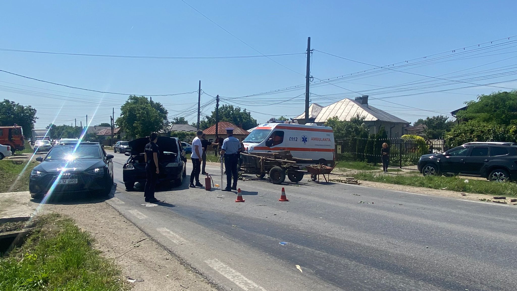 Patru persoane, pritre care doi copii de opt şi 11 ani, care se aflau într-o căruţă au fost rănite după ce atelajul a fost lovit de un autoturism, pe drumul naţional DN 7, în localitatea Călineşti.