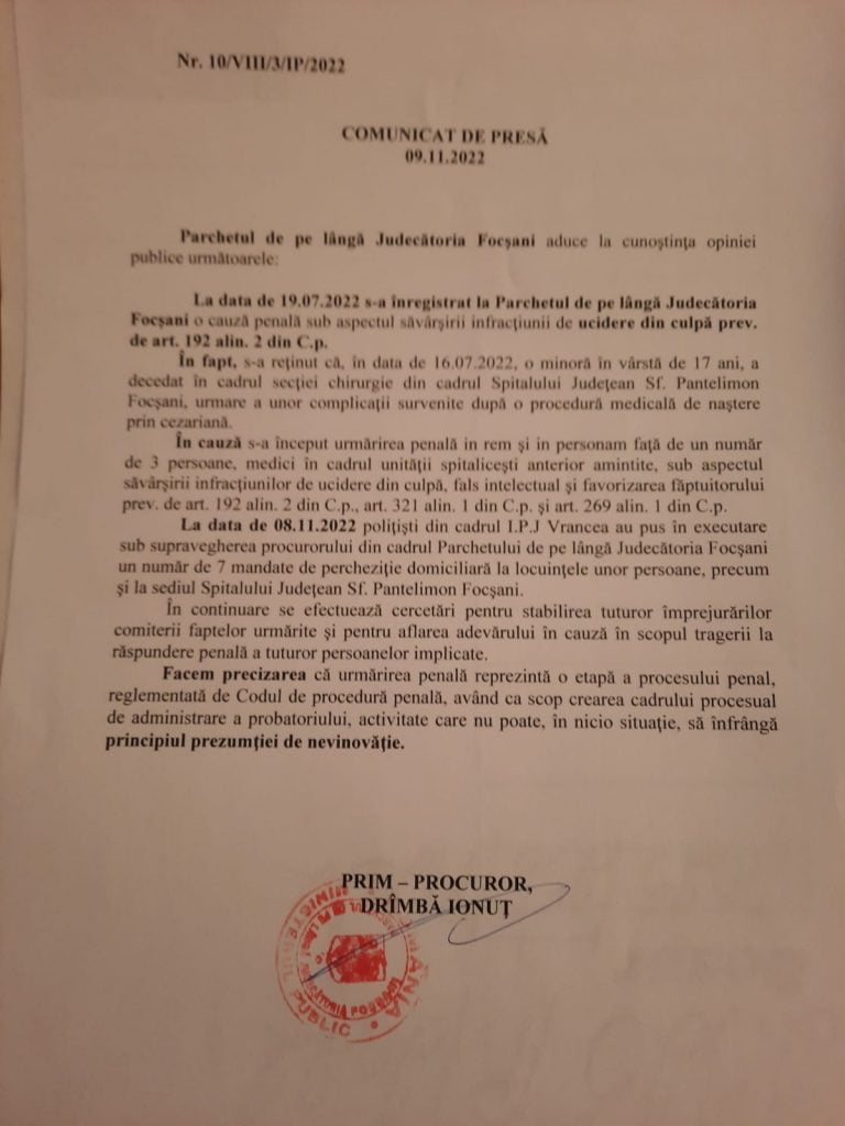 Un dosar de ucidere din culpă a fost deschis, miercuri, de procurorii din Focşani, după ce o adolescentă în vârstă de 17 ani a murit în urma mai multor operaţii de cezariană.