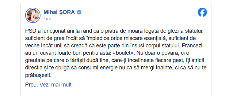 „PSD a funcționat ani la rând ca o piatră de moară legată de glezna statului: suficient de grea încât să împiedice orice mișcare esențială, suficient de veche încât unii să creadă că este parte din însuși corpul statului”, se arată pe pagina lui Mihai Șora.