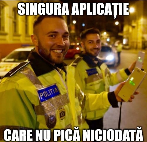 Reprezentanţii MAI postează o fotografie cu doi poliţişti care flutură aparatul etilotest, cu descrierea „singura aplicaţie care nu pică niciodată”.