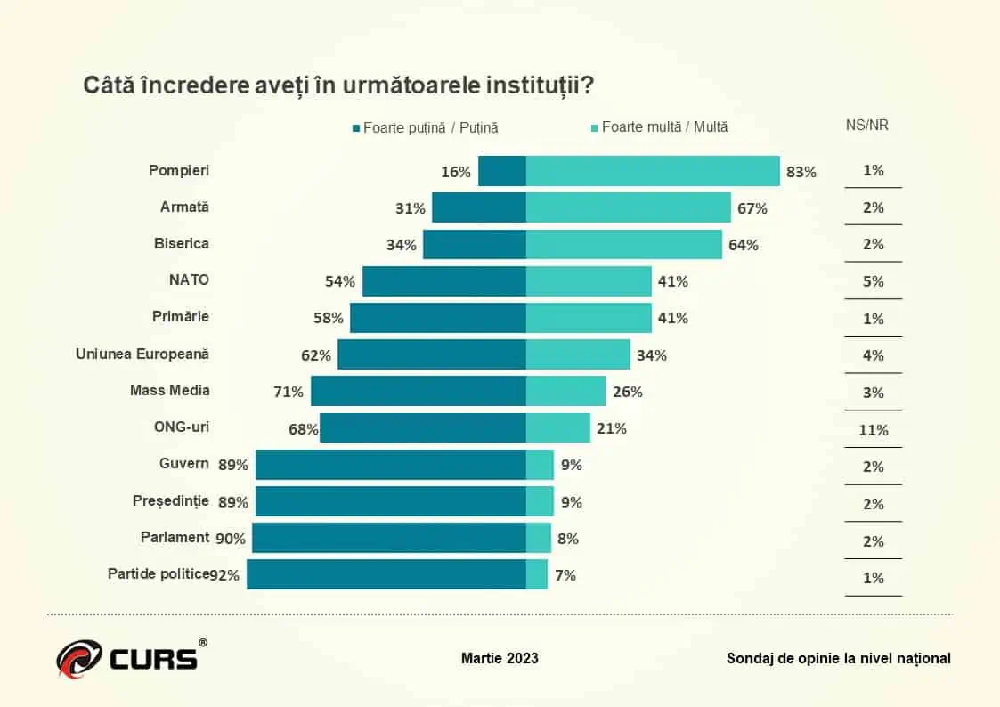 Guvernul, Președinția, Parlamentul și partidele politice sunt pe ultimul loc, cu mai puțin de 10% încredere și cu un grad extrem de mare de neîncredere.