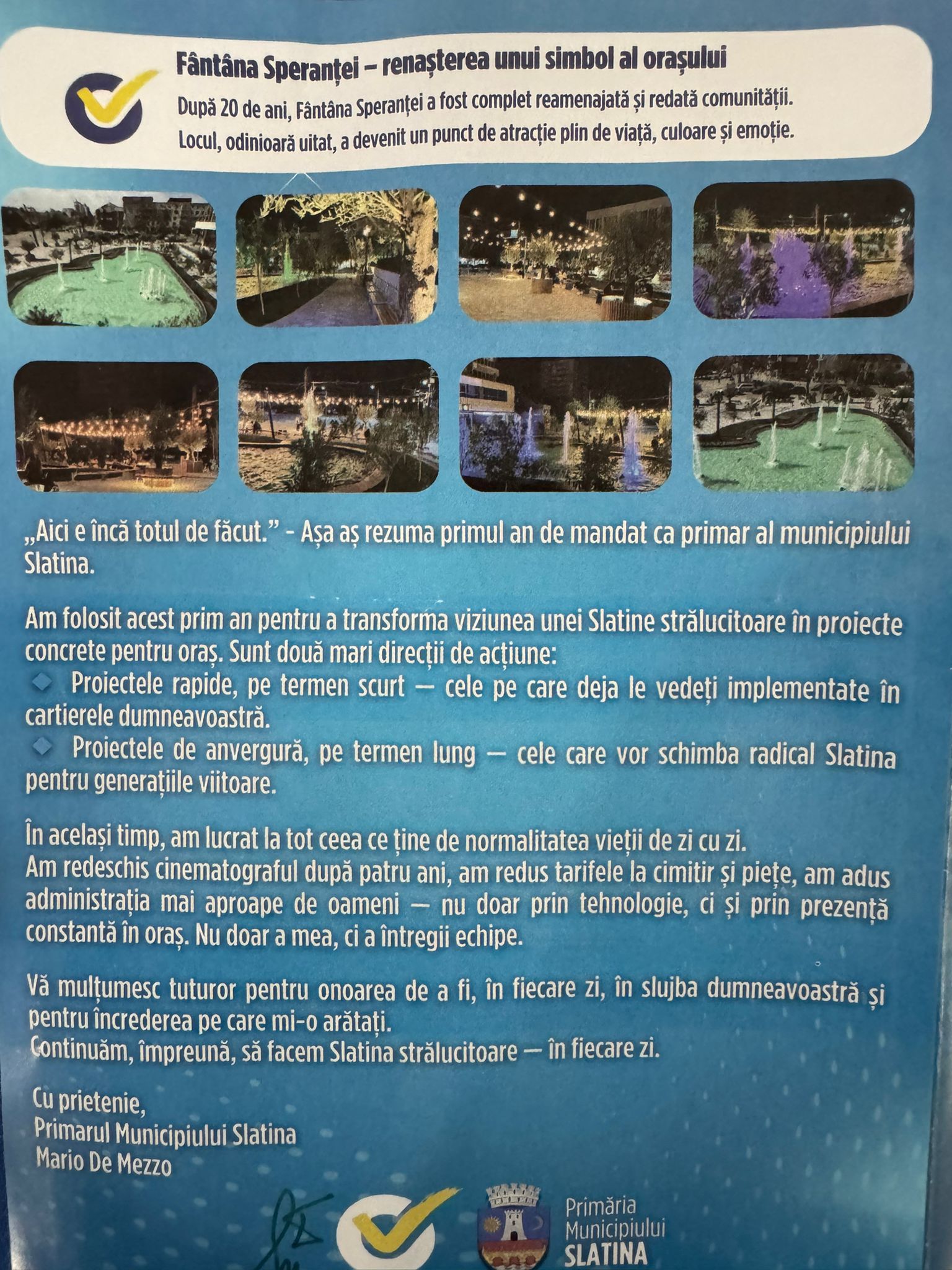 Primăria Slatina a comandat tipărirea unui număr impresionant de 37.000 de pliante menite să sintetizeze raportul de activitate al primarului Mario De Mezzo pentru primul an de mandat. Materialele informative au ajuns deja în scările de bloc din oraș. Firma care le-a tipărit are un singur angajat şi a primit contractul prin atribuire directă.