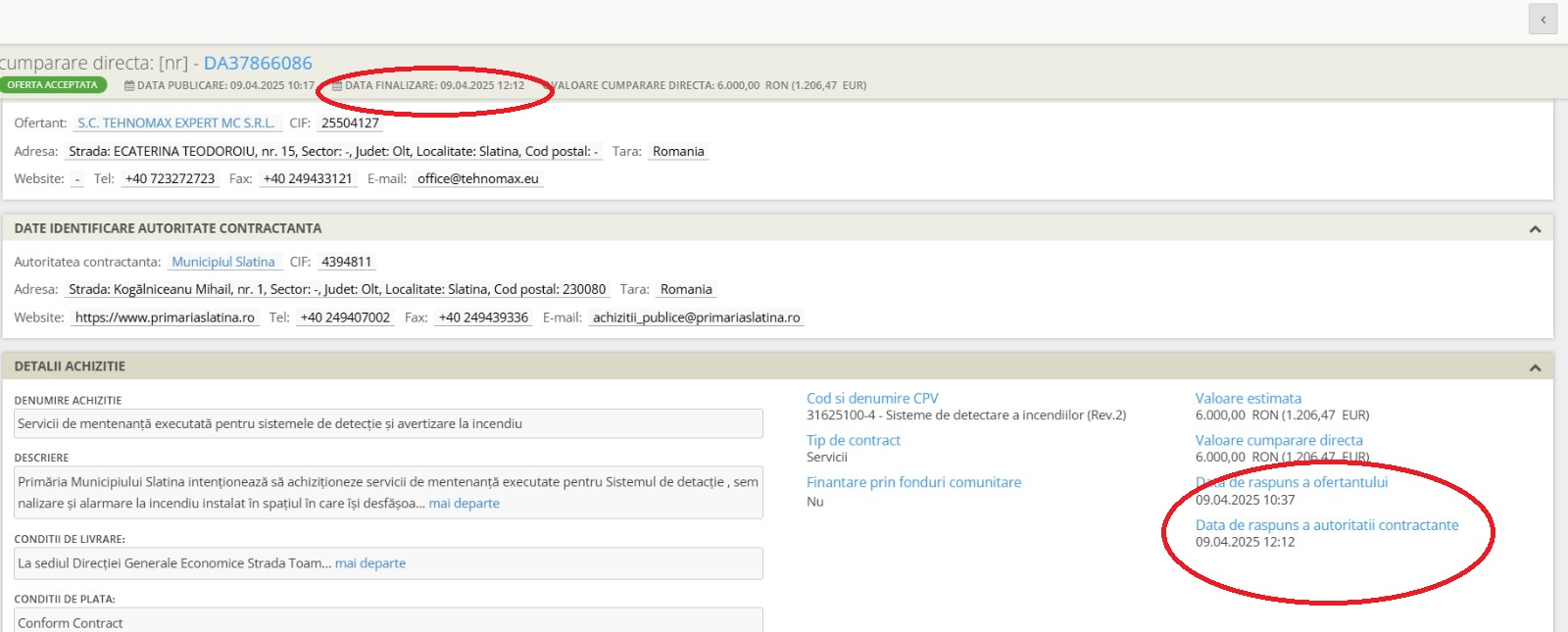Publicaţia „Imperativ” dezvăluie că, potrivit Sistemului Electronic de Achiziții Publice, în 9 aprilie 2025, Primăria Slatina a achiziționat servicii de mentenanță pentru sistemul de detecție, semnalizare și alarmare la incendiu, pentru o perioadă de 12 luni, de la firma Tehnomax Expert MC SRL. Contractul prevedea lucrări la sediul Direcției Generale Economice, însă documentele arată că firma a avut și contracte pentru lucrări de întreținere la grădinițele sancționate de ISU.
