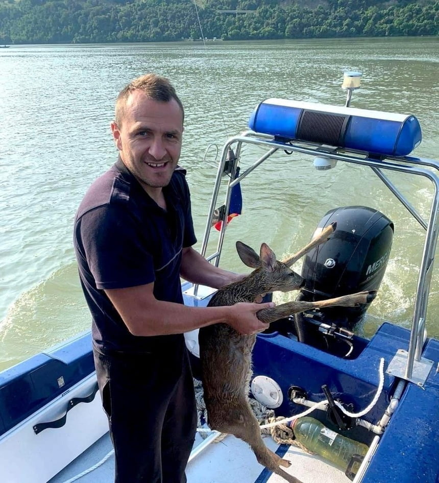 ”Astăzi, colegii noştri, Saşa şi Adrian, din cadrul Sectorului Poliţiei de Frontieră Berzeasca – Inspectoratul Teritorial al Poliţiei de Frontieră Timişoara, aflaţi în misiune de patrulare pe fluviul Dunărea, au observat la aproximativ 100 m de mal, un pui de căprioară care abia mai putea să înoate. Nu au stat prea mult pe gânduri şi, imediat, s-au îndreptat spre el în încercarea de a-l salva. Epuizat fiind, puiul de căprioară cu greu se mai menţinea la nivelul apei. Cu multă grijă, colegii au reuşit să îl scoată din apele fluviului şi l-au imobilizat cu atenţie deoarece era foarte speriat şi agitat”, a transmis Poliţia de Frontieră.