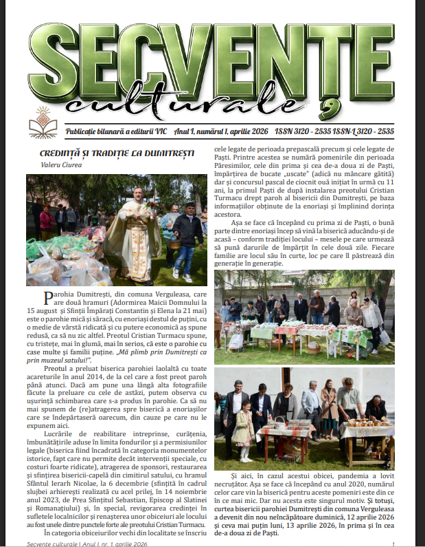 S-a lansat revista „Secvențe culturale”, o inițiativă editorială curajoasă care își propune să readucă în prim-plan bogăția inestimabilă a patrimoniului cultural și spiritual. Fondată de Valeru Ciurea, publicația a apărut la finele lunii aprilie 2026 sub egida Editurii VIC, fiind un demers jurnalistic dedicat exclusiv culturii. Înregistrată la Biblioteca Națională a României cu codul ISSN 3120–2535, revista are o frecvență bilunară și este accesibilă publicului larg atât în format tipărit, cât și în variantă online.