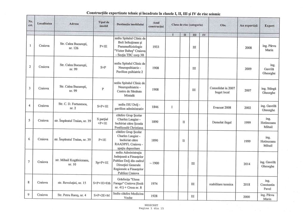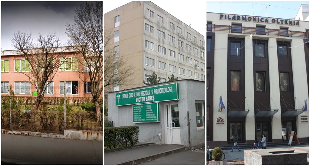 Încadrate în diferite clase de risc seismic, găsim pe listă mai multe sedii ale Spitalului Clinic de Boli Infecţioase şi Pneumoftiziologie „Victor Babeş”, de pe Calea Bucureşti, un pavilion administrativ al ISU, de pe strada CD Fortunescu, o clădire folosită de RAADPFL Craiova de pe strada Împăratul Traian, dar şi sediul Finanţelor Dolj, de pe strada Mihail Kogălniceanu.