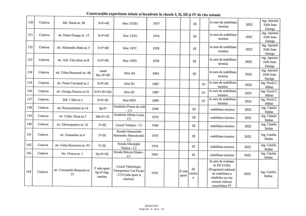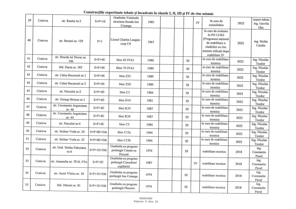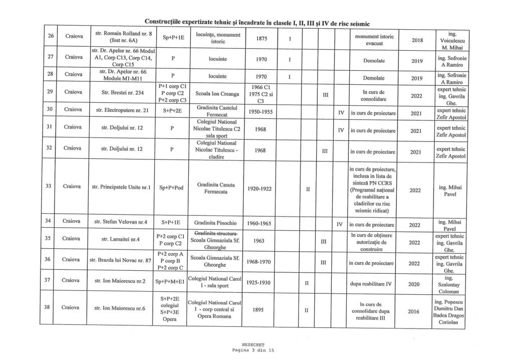 Totodată, clădiri încadrate într-un anumit risc seismic sunt Grădiniţa „Elena Farago” din Craiova, de pe strada Revoluţiei, sediul Filarmonicii Oltenia de pe Calea Unirii (foto deschidere), dar şi două sedii ale Primăriei Craiova de pe strada A.I. Cuza.