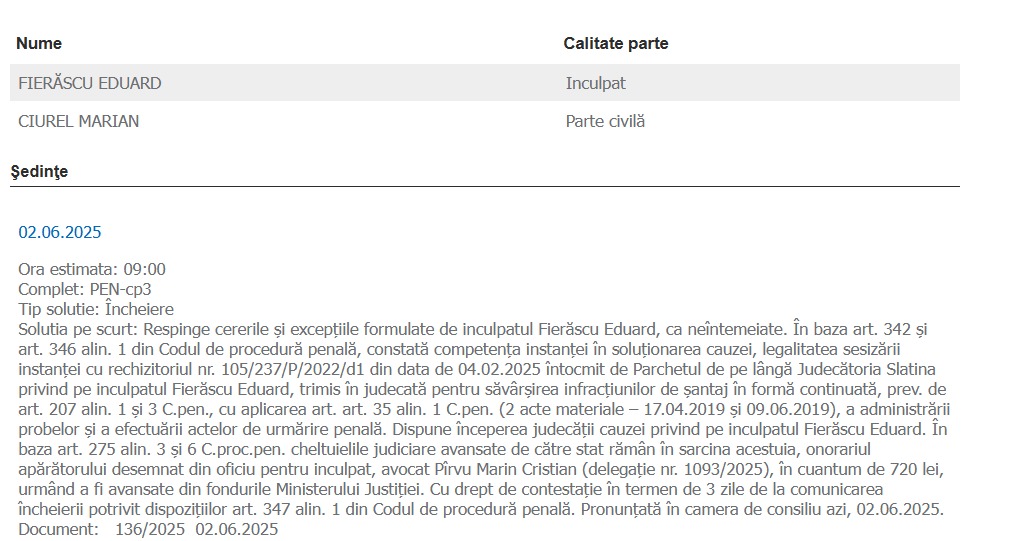 „Solutia pe scurt: Respinge cererile şi excepţiile formulate de inculpatul Fierăscu Eduard, ca neîntemeiate. În baza art. 342 şi art. 346 alin. 1 din Codul de procedură penală, constată competenţa instanţei în soluţionarea cauzei, legalitatea sesizării instanţei cu rechizitoriul nr. 105/237/P/2022/d1 din data de 04.02.2025 întocmit de Parchetul de pe lângă Judecătoria Slatina privind pe inculpatul Fierăscu Eduard, trimis în judecată pentru săvârşirea infracţiunilor de şantaj în formă continuată, prev. de art. 207 alin. 1 şi 3 C.pen., cu aplicarea art. art. 35 alin. 1 C.pen. (2 acte materiale – 17.04.2019 şi 09.06.2019), a administrării probelor şi a efectuării actelor de urmărire penală. Dispune începerea judecăţii cauzei privind pe inculpatul Fierăscu Eduard. În baza art. 275 alin. 3 şi 6 C.proc.pen. cheltuielile judiciare avansate de către stat rămân în sarcina acestuia, onorariul apărătorului desemnat din oficiu pentru inculpat, avocat Pîrvu Marin Cristian (delegaţie nr. 1093/2025), în cuantum de 720 lei, urmând a fi avansate din fondurile Ministerului Justiţiei. Cu drept de contestaţie în termen de 3 zile de la comunicarea încheierii potrivit dispoziţiilor art. 347 alin. 1 din Codul de procedură penală. Pronunţată în camera de consiliu azi, 02.06.2025.
