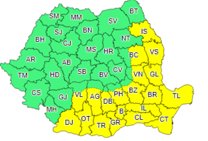 Județele vizate de Codul galben de caniculă sunt: Prahova, Dâmbovița, Argeș, Vâlcea, Dolj, Iași, Bacău, Vaslui, Vrancea, Galați, Buzău, Brăila, Tulcea, Ialomița, Constanța, Ilfov, Călărași, Giurgiu, Teleorman și Olt.