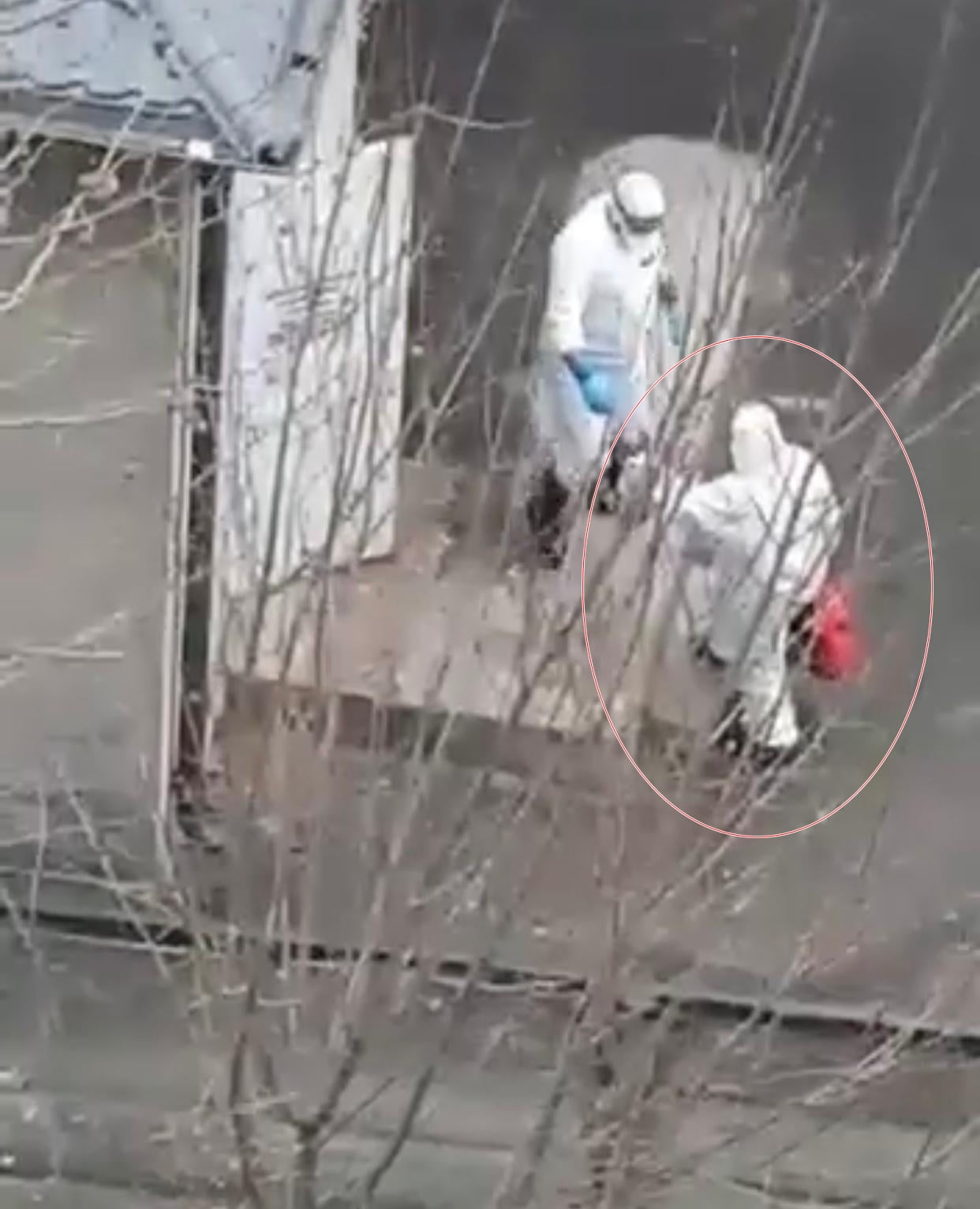 Femeia a fost surprinsă în timp ce este adusă, cu autospeciala ATPVM a ISU Olt, la secţia de Boli Infecţioase a Spitalului Slatina.