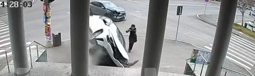 În imaginile care au surprins momentul impactului se vede cum maşina care a ajuns pe trotuar loveşte nişte scări şi se răstoarnă peste o femeie, eşi aceasta a încercat să se ferească. Femeia a fost rănită, fiind transportată la spital.